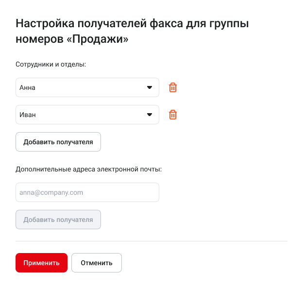 Чтобы удалить настройки факса номера, в блоке «Получатели факса» нажмите на корзину справа от этого номера.