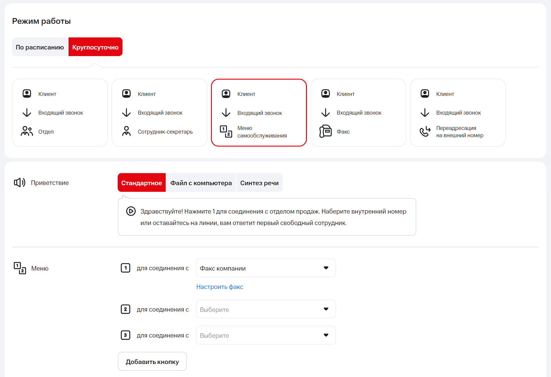 Выберите режим работы «Круглосуточно» и вариант распределения звонков на «Голосовое меню». Назначьте факс на одну из кнопок голосового меню.