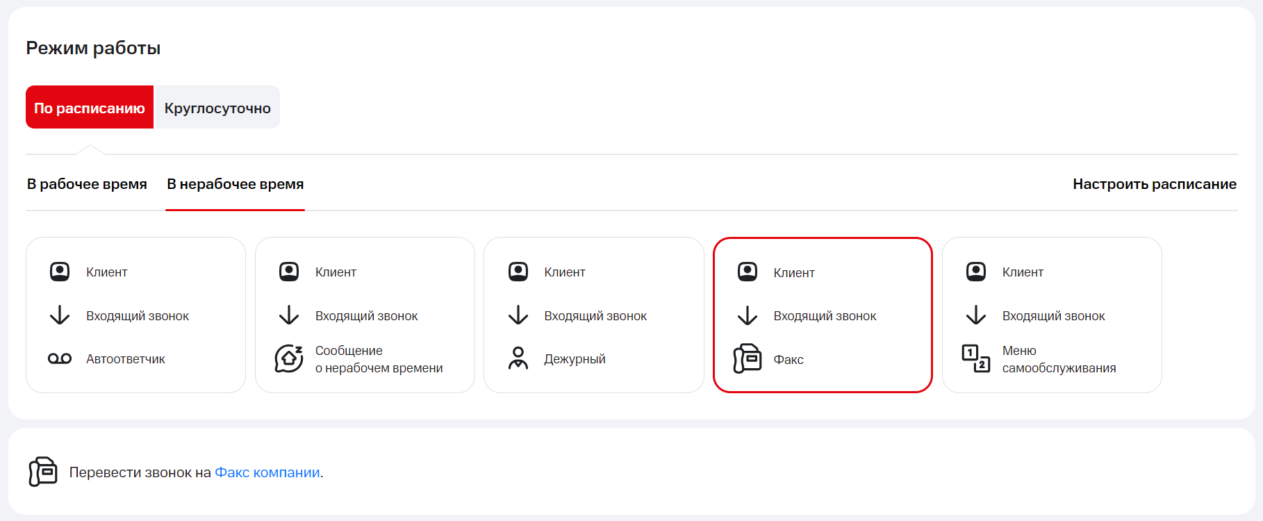 В разделе «Номера» выберите режим работы «По расписанию» и во вкладке «В нерабочее время» выберите перевод входящего звонка на факс.