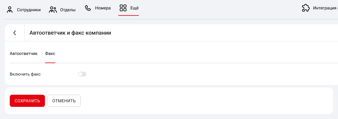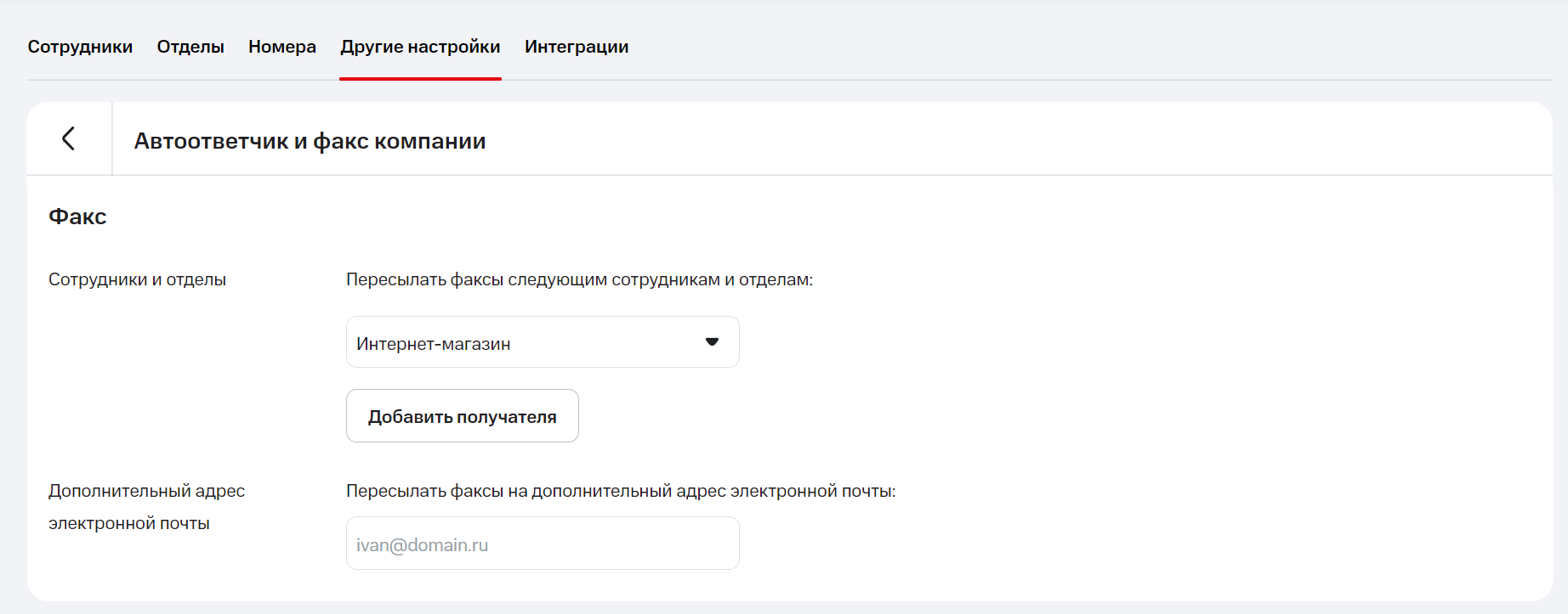 Чтобы посмотреть настройки всех факсов компании, перейдите в «Настройки» – «Другие настройки» – «Автоответчик и факс компании» – вкладка «Факс».