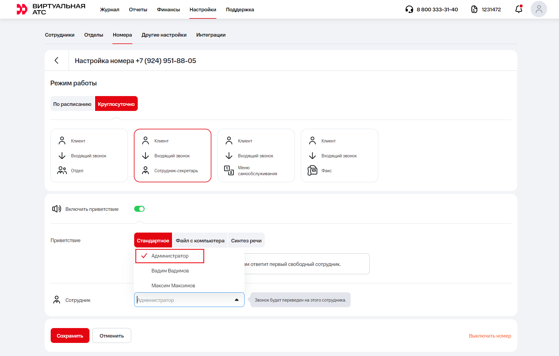 Например, если вы хотите, чтобы входящие принимал сотрудник, к которому привязана SIM-карта, перейдите в раздел «Настройки» – «Номера». Найдите маршрут «Сотрудник-секретарь» и в поле «Сотрудник» выберите нужное имя из списка. Нажмите «Сохранить».