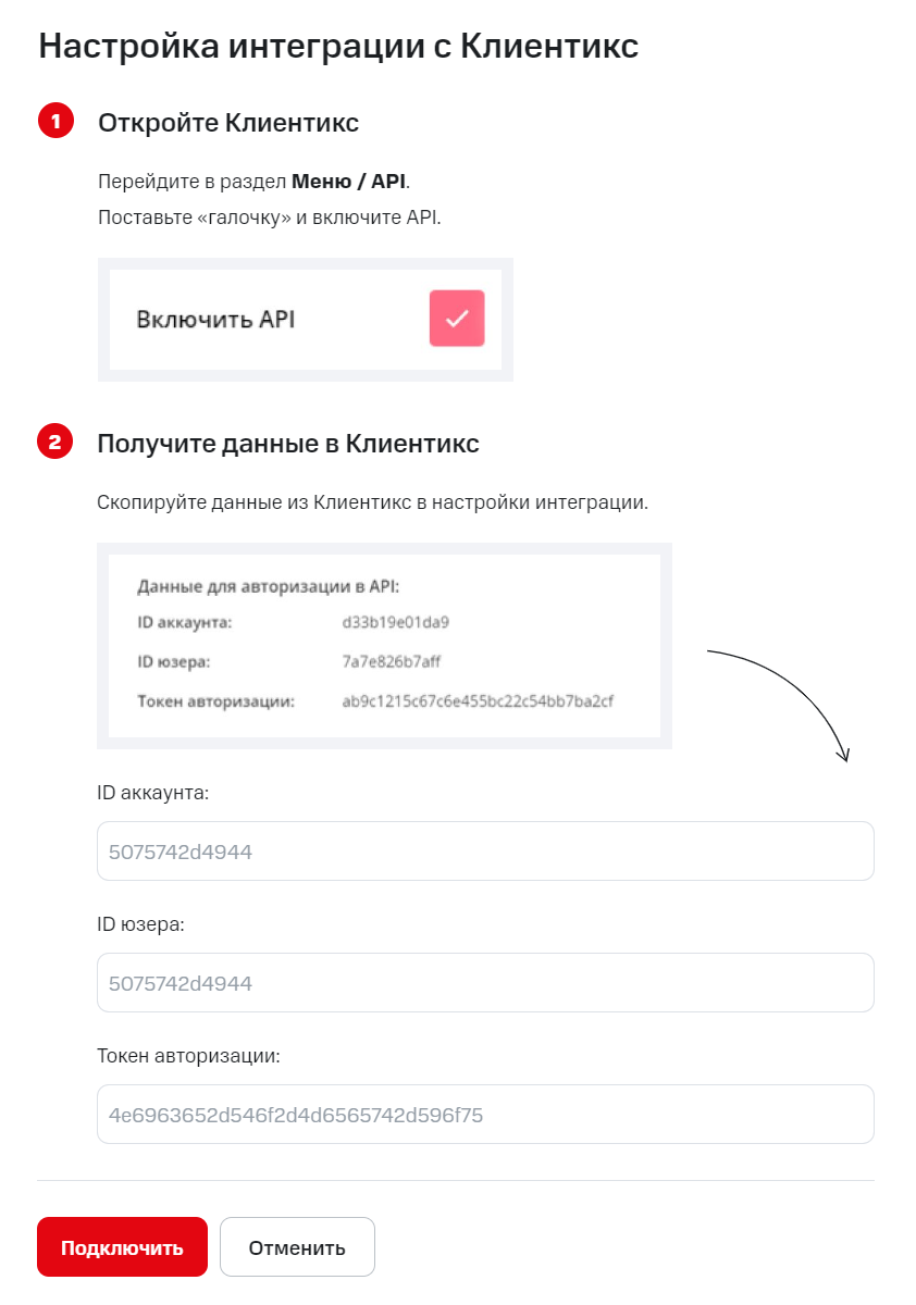 В настройках интеграции введите ID-аккаунта, ID юзера и токен авторизации.