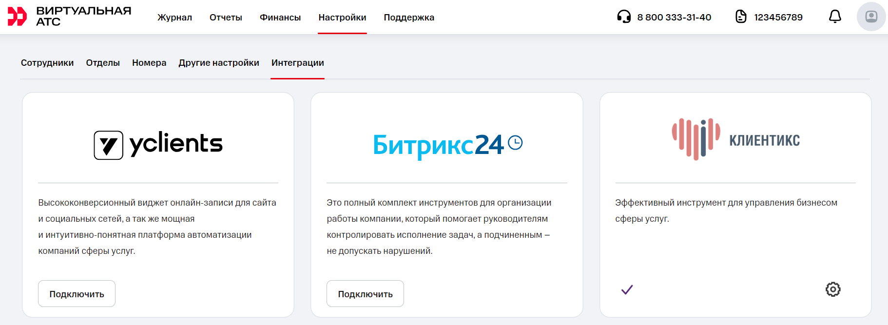 2. В Виртуальной АТС зайдите в «Настройки» – «Интеграции» – «Клиентикс». Нажмите «Подключить».