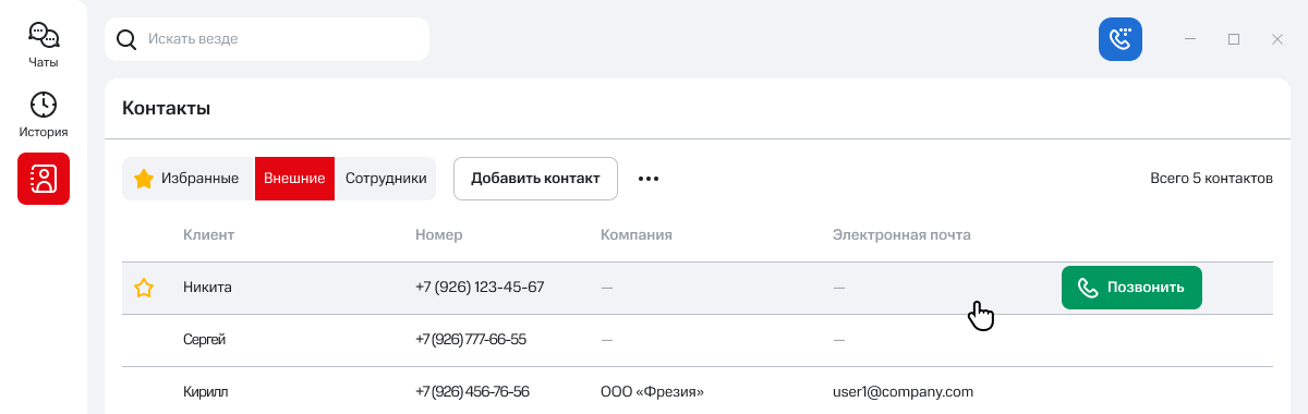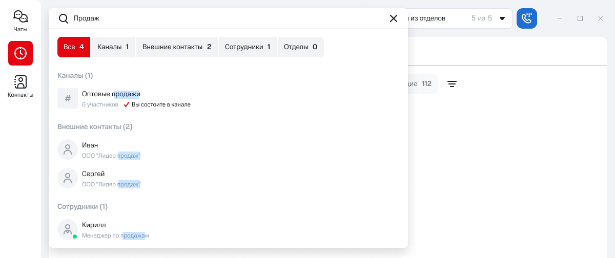 Чтобы быстро найти нужного клиента, коллегу или канал, воспользуйтесь единым окном поиска. Прямо из окна поиска можно написать или позвонить контакту.