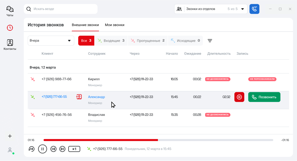 Чтобы не терять пропущенные, их число отображается в боковом меню у иконки истории. В истории звонков вы сможете узнать больше о контакте и быстро ему перезвонить. Гибкая система фильтров помогает найти любой звонок в архиве и при необходимости прослушать его запись.