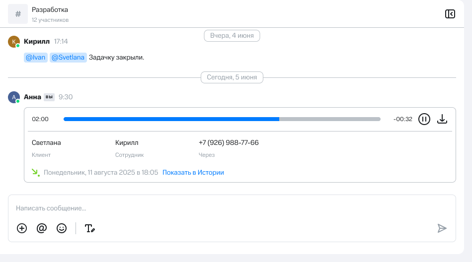 Запись можно прослушать и скачать прямо в чате.