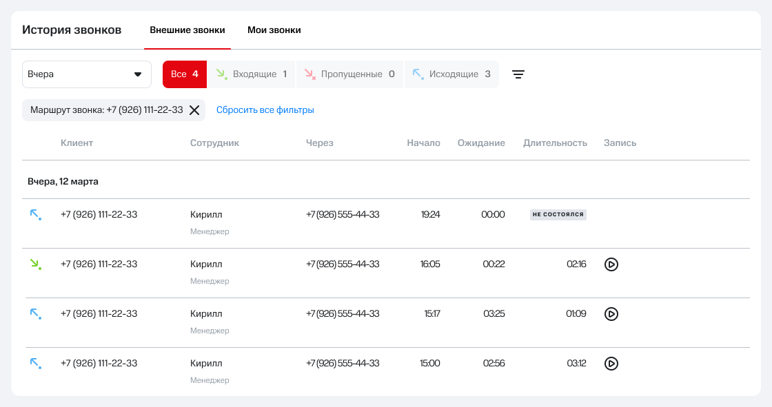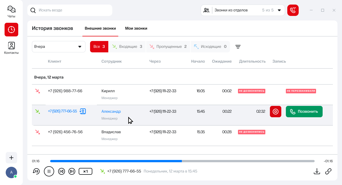 Благодаря фильтру «Контроль пропущенных» вы сможете легко найти непринятые звонки, на которые сотрудники не перезванивали или не дозвонились.
