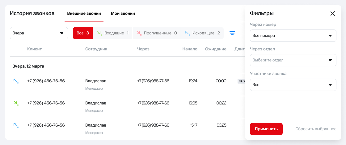 Выберите нужные вам значения фильтров и нажмите «Применить». В таблице останутся только те звонки, которые соответствуют заданным параметрам.