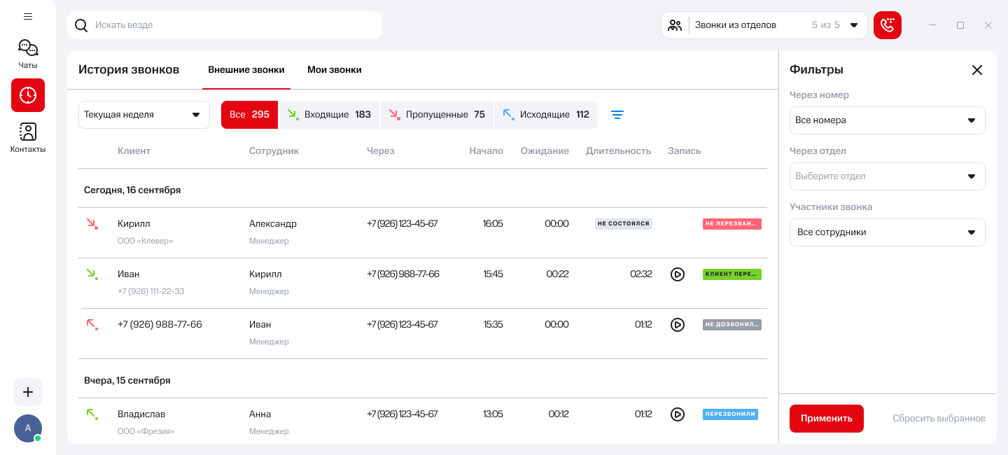• фильтровать звонки по номерам, отделам, сотрудникам, клиентам и типам вызовов за нужный период;