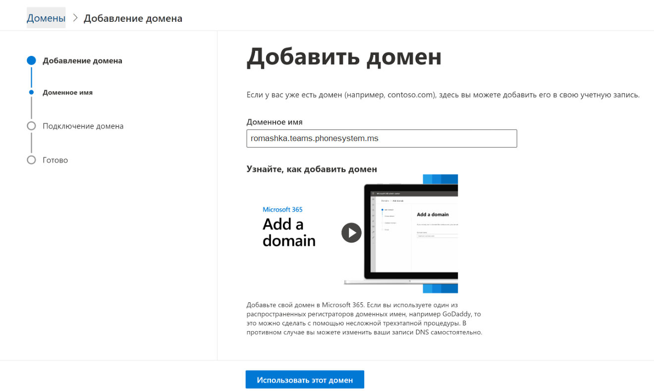 Для интеграции необходимо получить домен в зоне *.teams.phonesystem.ms, который будет использован для подключения вашей Виртуальной АТС. Запросите у нашего менеджера такой домен. Обычно вместо * указывается название вашей компании. Например, если ваша компания называется ООО «Ромашка», то вы получите домен romashka.teams.phonesystem.ms.1. Зайдите в Центр администрирования доменом Office 365.