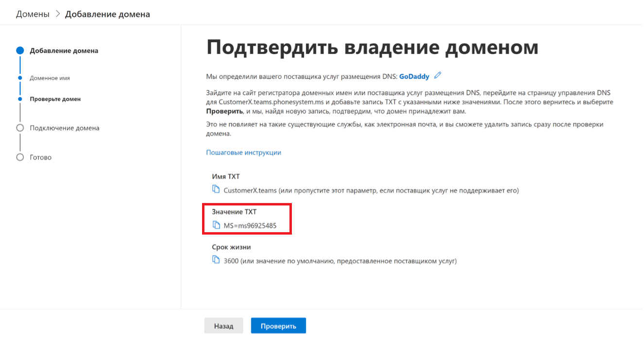 5. В открывшемся окне скопируйте Значение TXT вида MS=ms96925485 и вышлите его вашему менеджеру.