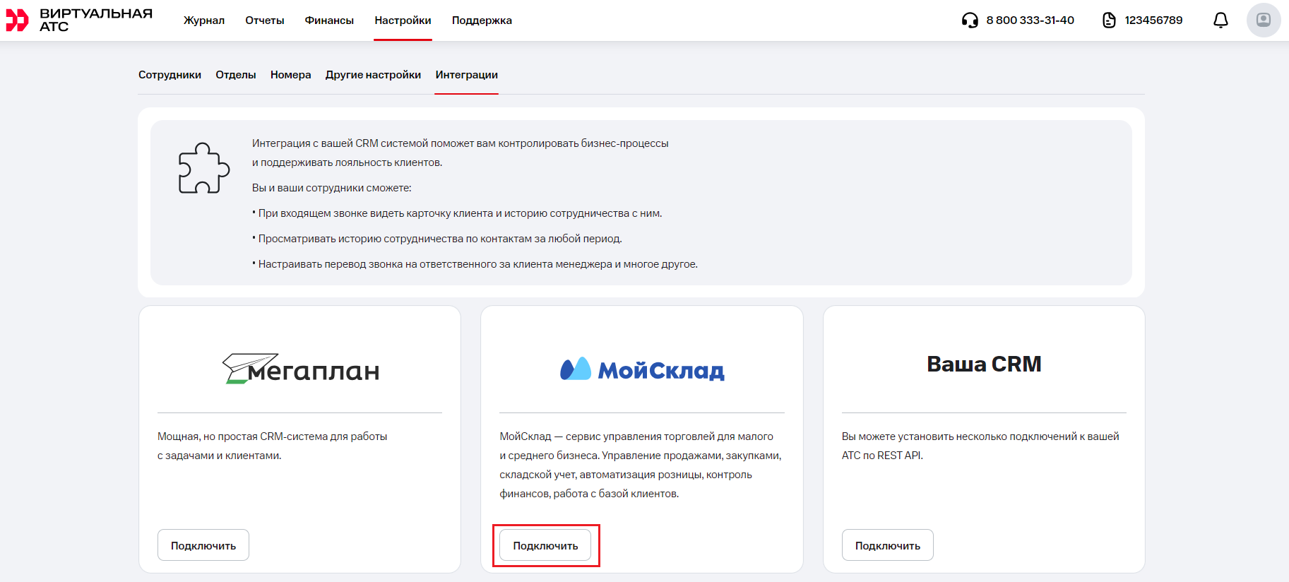 1. В разделе «Интеграция с CRM» вашей Виртуальной АТС найдите карточку МойСклад.