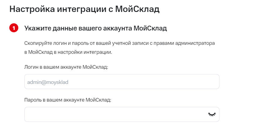 В открывшемся окне настройки интеграции укажите логин и пароль от вашего аккаунта администратора в МойСклад.