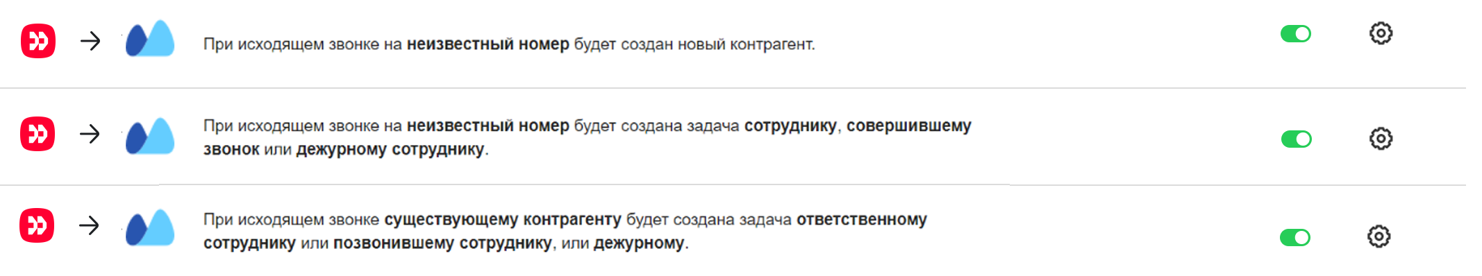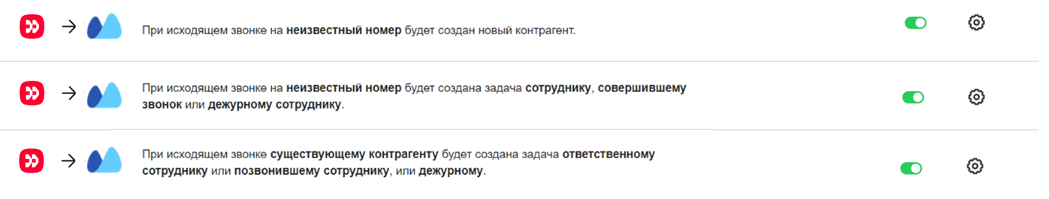 • после звонка с участием неизвестного номера (успешного и неуспешного, входящего и исходящего) могут быть автоматически созданы новый контрагент и задача на сотрудника;