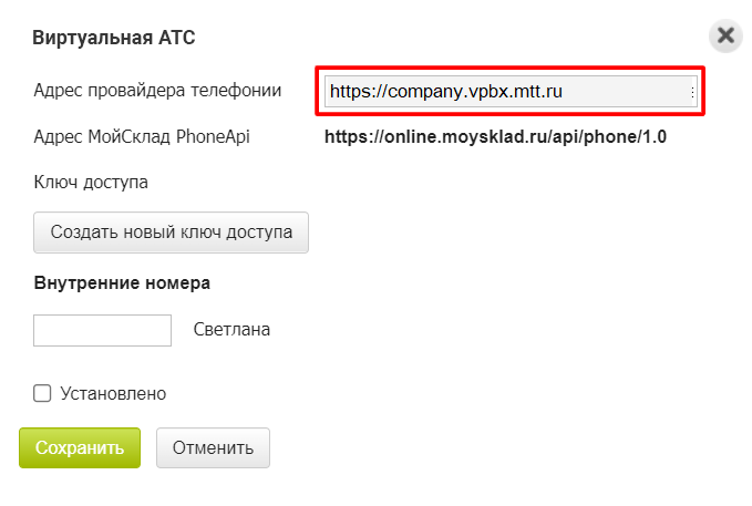 4. В поле «Адрес провайдера телефонии» вставьте адрес вашей Виртуальной АТС, скопированный на шаге 2.