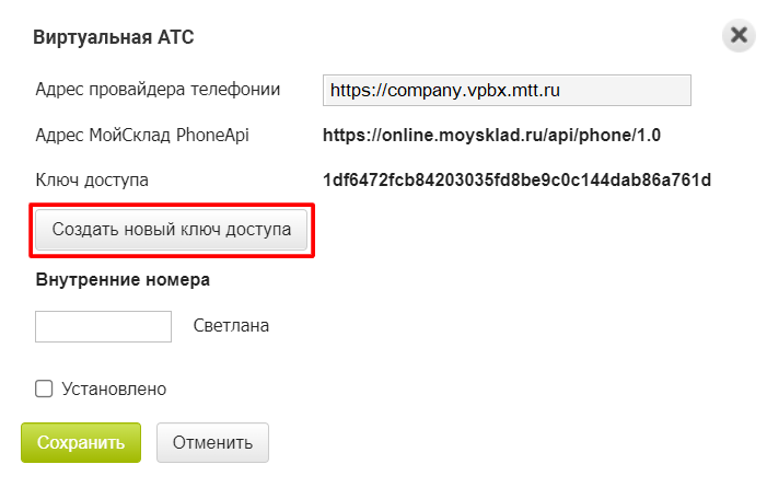 6. Вернитесь в интерфейс Виртуальной АТС и в поле «Ключ доступа» вставьте скопированный ключ.