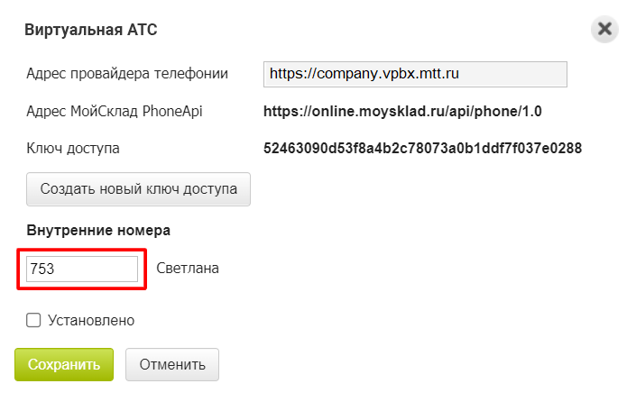 8. Поставьте «галочку» напротив «Установлено» и нажмите «Сохранить». Убедитесь, что в карточке приложения «МойСклад Phone API» появилась надпись «Установлено».