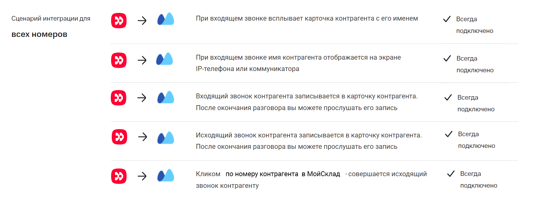 10. Настройте сценарии (правила) интеграции сервиса МойСклад и Виртуальной АТС. Некоторые сценарии интеграции подключаются автоматически без возможности внести в них изменения.