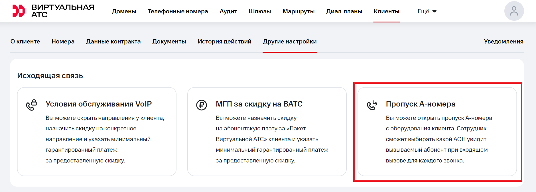 1. Перейдите в раздел «Другие настройки» – «Пропуск А-номера».