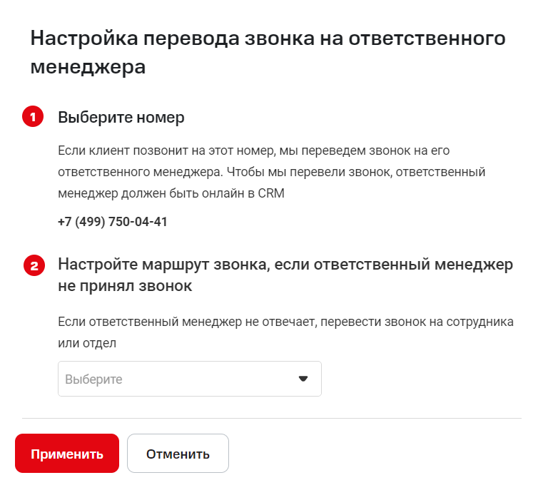 А затем данную опцию: выберите номер и настройте маршрут звонка, если ответственный менеджер не принял звонок. Можно перевести звонок на сотрудника или отдел.