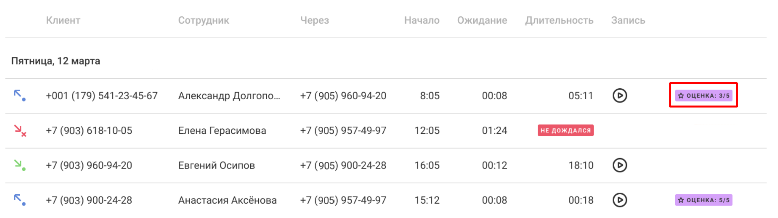 Если клиент поставил оценку качества обслуживания, вы сразу же увидите ее в разделе Журнал справа от записи разговора.