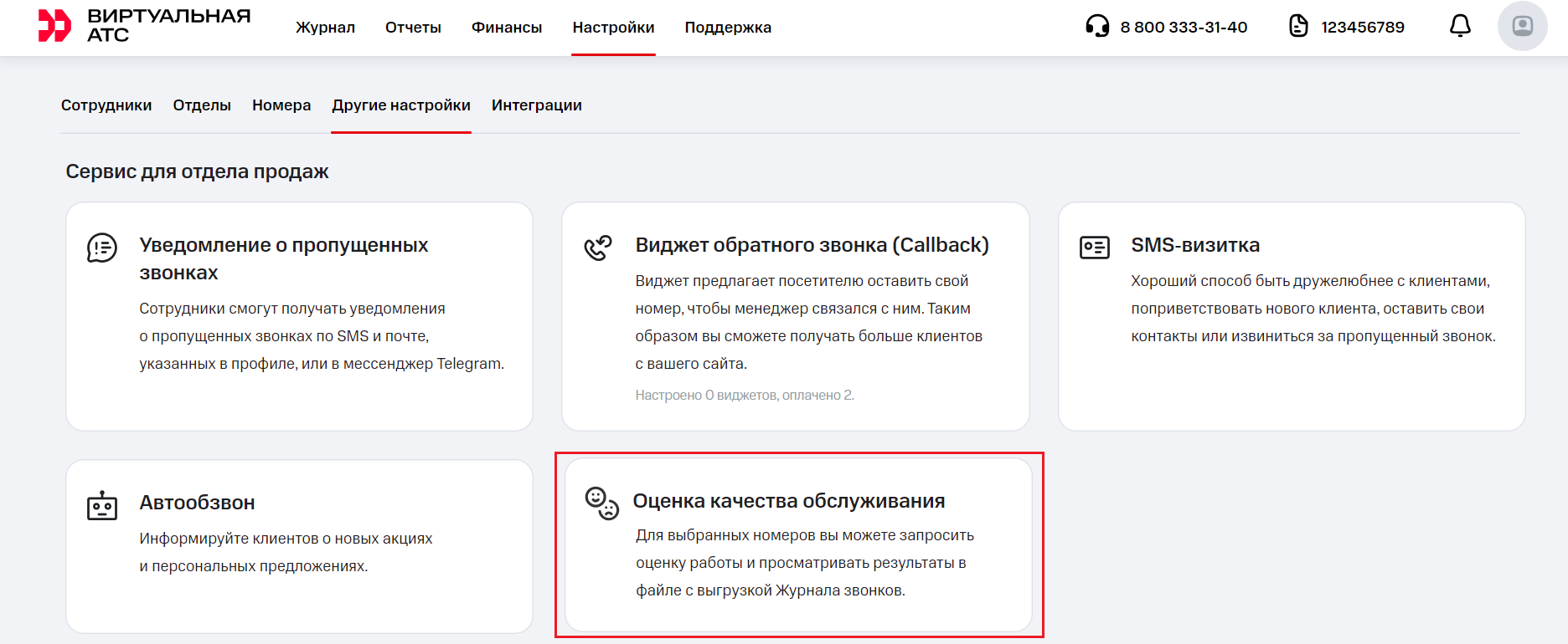 1. В настройках вашей Виртуальной АТС перейдите в раздел «Другие настройки» и найдите там опцию «Оценка качества обслуживания».