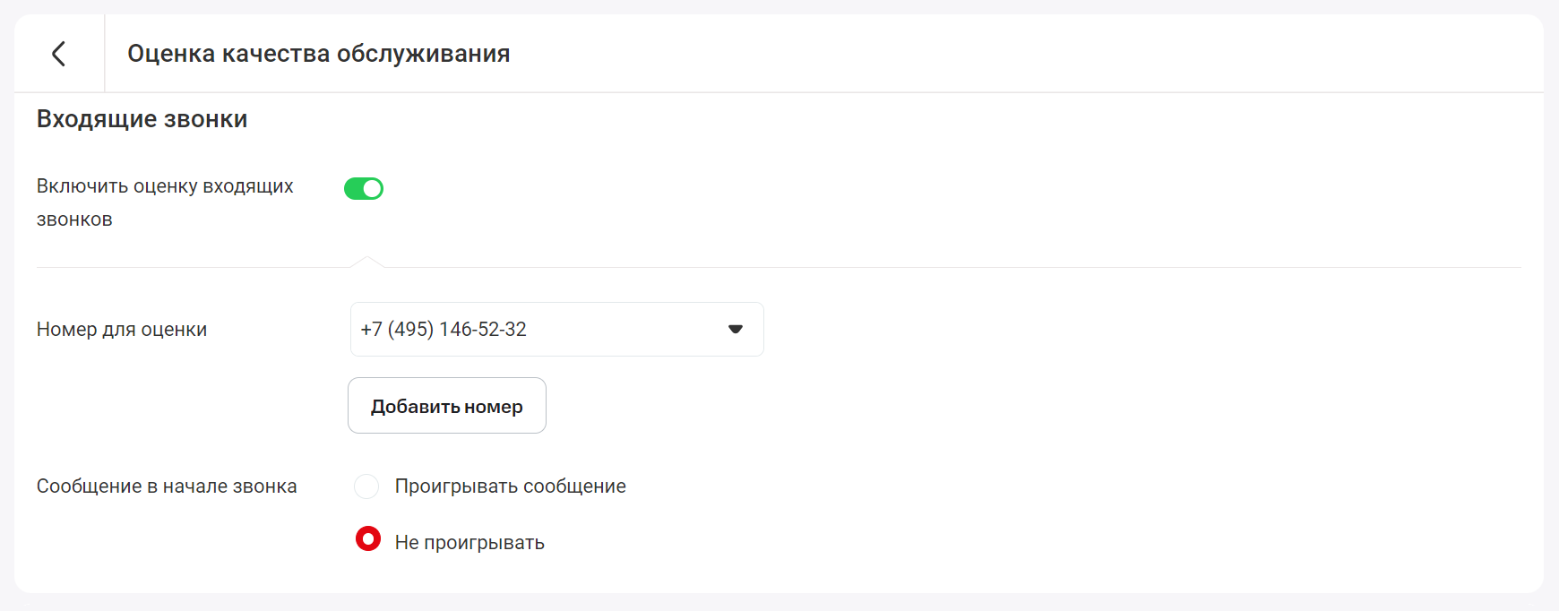 2. Включите оценку входящих звонков (сдвиньте переключатель вправо) и выберите номера, при звонках на которые Виртуальная АТС будет предлагать клиентам оценить разговор.