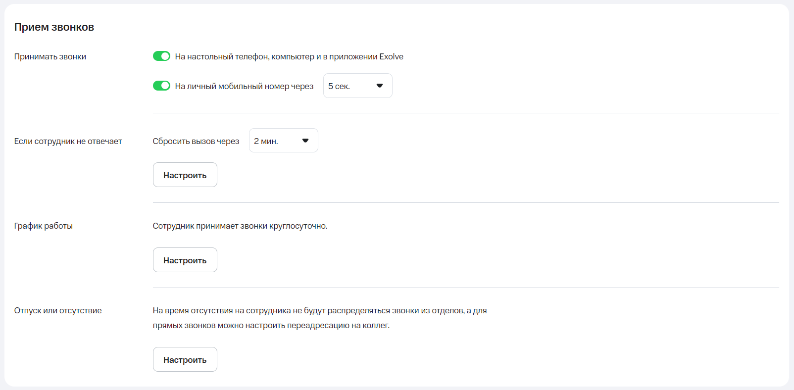 2. В настройках сотрудника пролистайте вниз до раздела «Прием звонков». Выберите, куда поступит звонок — только на мобильный телефон, на компьютер и настольный телефон или на все устройства сотрудника сразу.