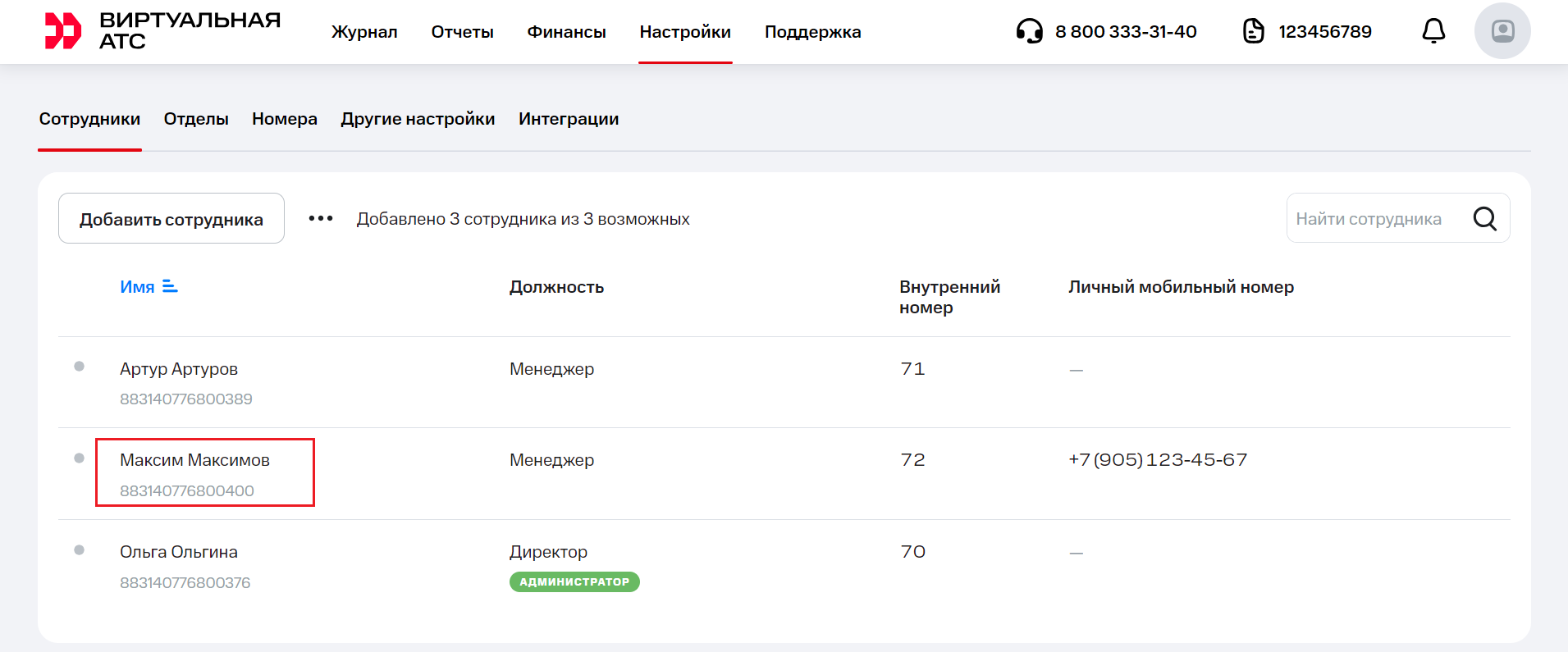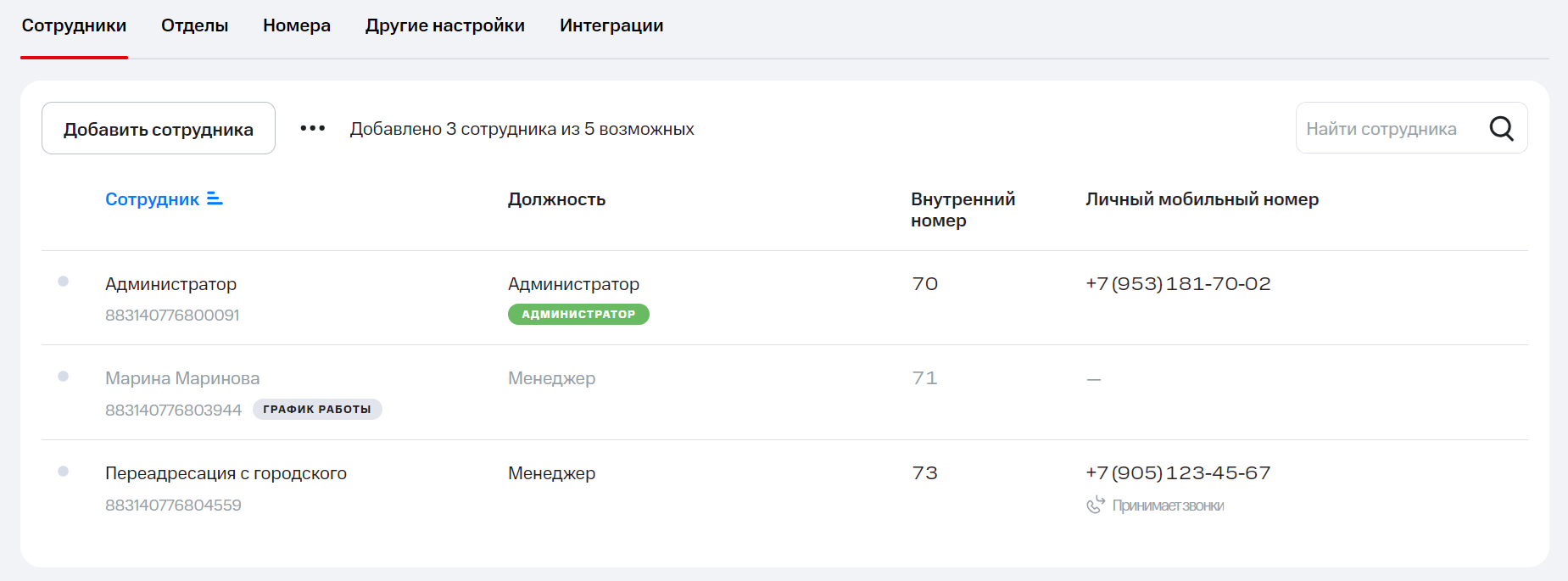 1. Перейдите в раздел Сотрудники. В АТС уже создан аккаунт сотрудника, на номер которого вы хотите настроить переадресацию?