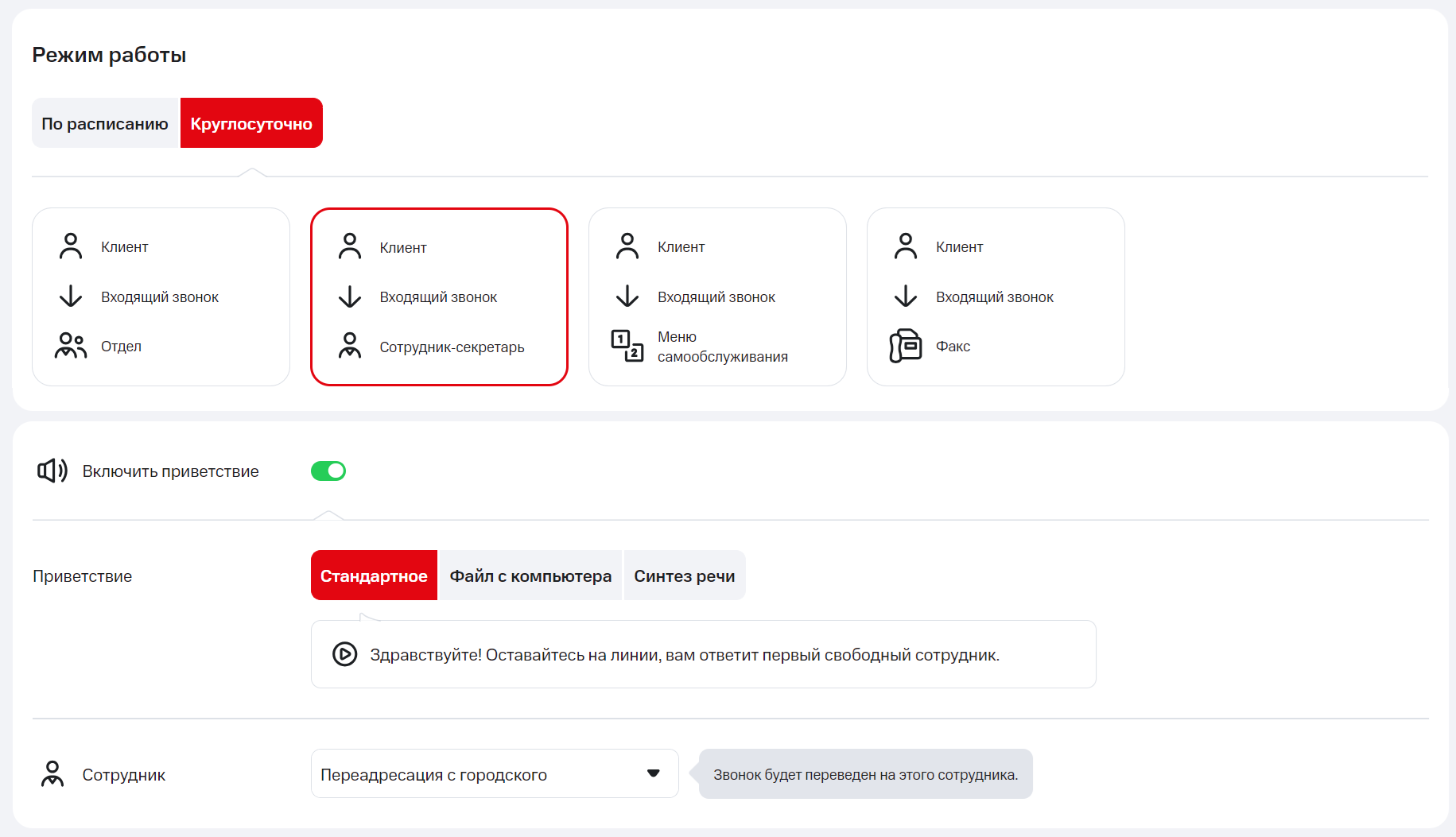 Затем в разделе Номера выберите нужный вам режим работы и настройте распределение звонка на сотрудника-секретаря.