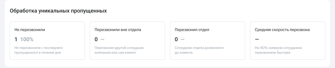• Перезвонил отдел — количество и доля уникальных номеров среди пропущенных отделом, по которым состоялся успешный перезвон сотрудниками отдела.