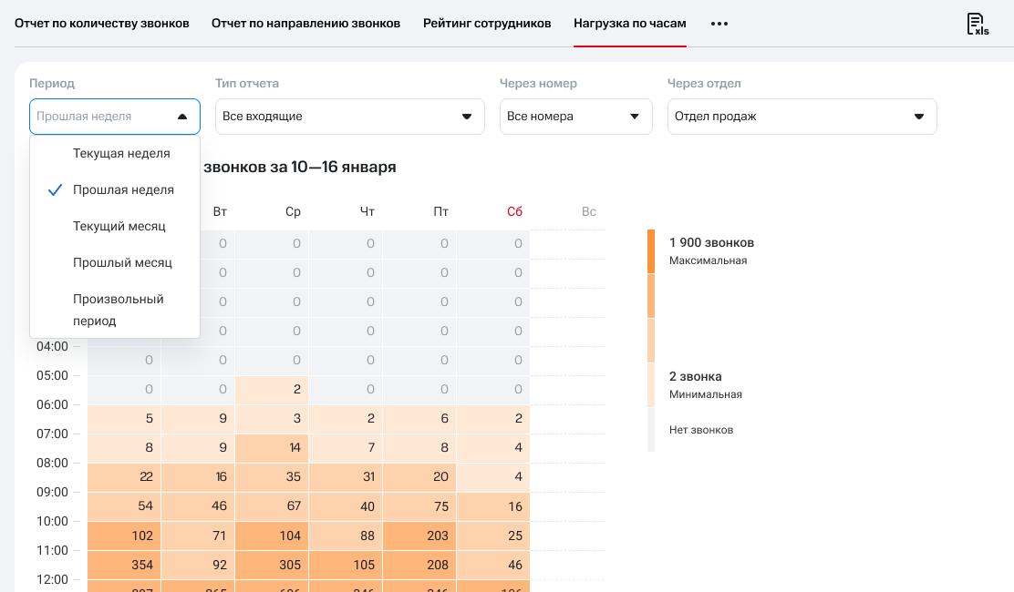 Отчет «Нагрузка по часам» показывает, в какое время и в какие дни недели сотрудники чаще и дольше всего общаются с клиентами.