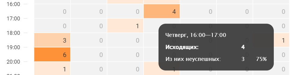 3. По неуспешным исходящим поймете, в какое время клиенты реже берут трубку и когда эффективнее их обзванивать. Для объективности учитывайте не только число неуспешных исходящих, но и их долю среди всех исходящих в выбранный час. Чтобы узнать долю неуспешных звонков среди всех исходящих, откройте отчет по всем исходящим и наведите курсор на любую ячейку.