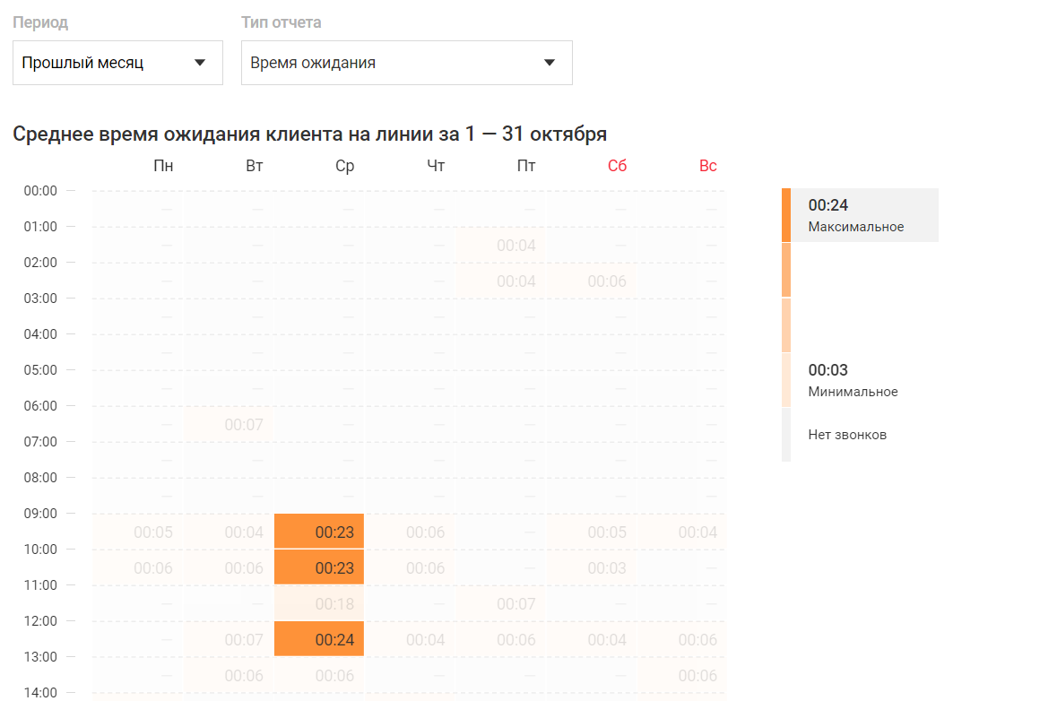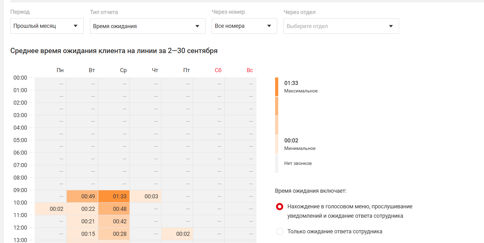 4. По времени ожидания вы поймете, сколько времени в среднем клиент ждал на линии. Ориентируясь на этот отчет, вы сможете менять маршруты звонков и расписание сотрудников так, чтобы среднее время ожидания стало меньше.
