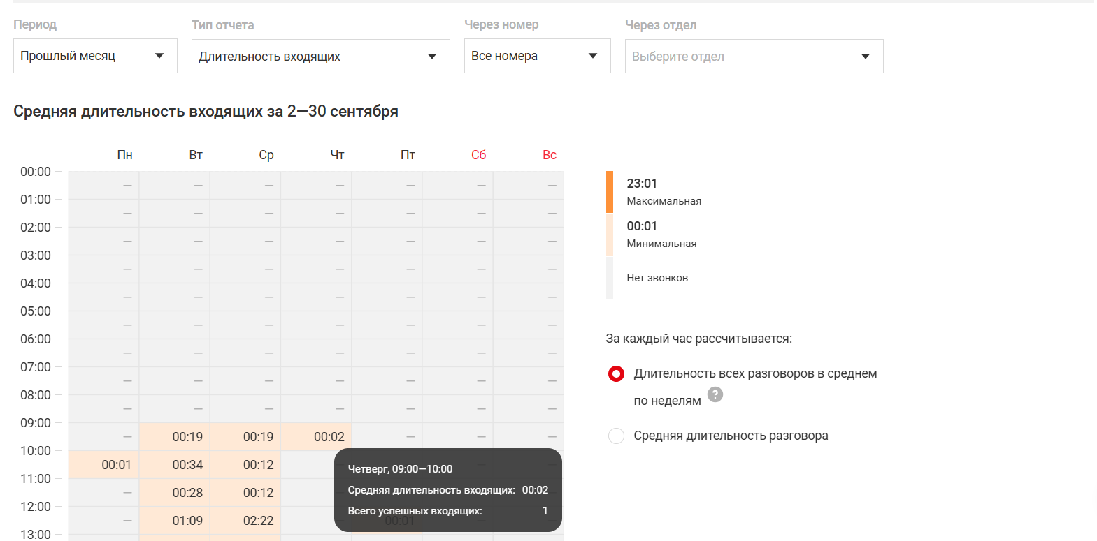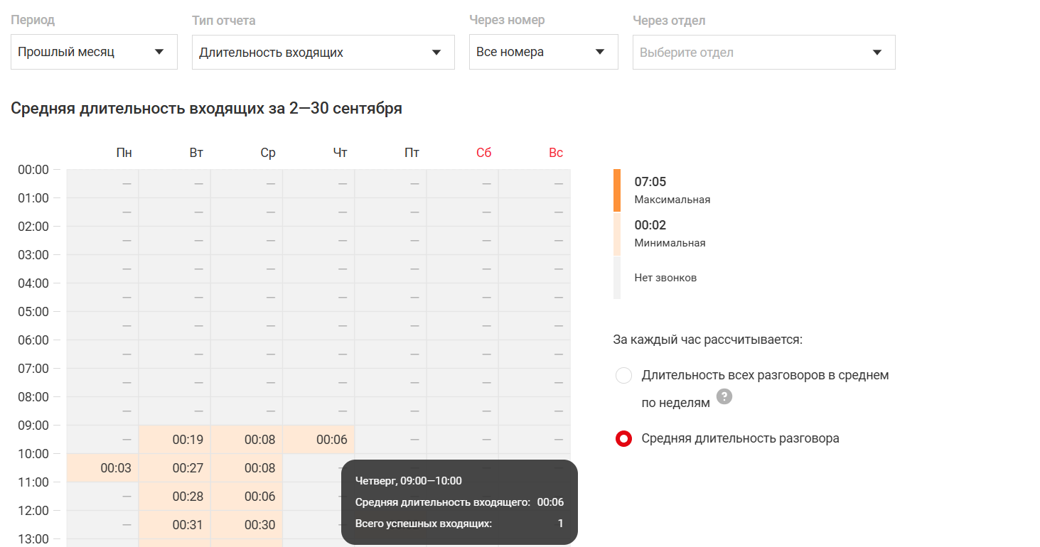 - Длительность всех разговоров в среднем по неделям — это средняя суммарная длительность входящих в этот час в выбранном периоде. Значение ячейки «Чт с 9:00 до 10:00» в таком случае будет рассчитываться иначе: