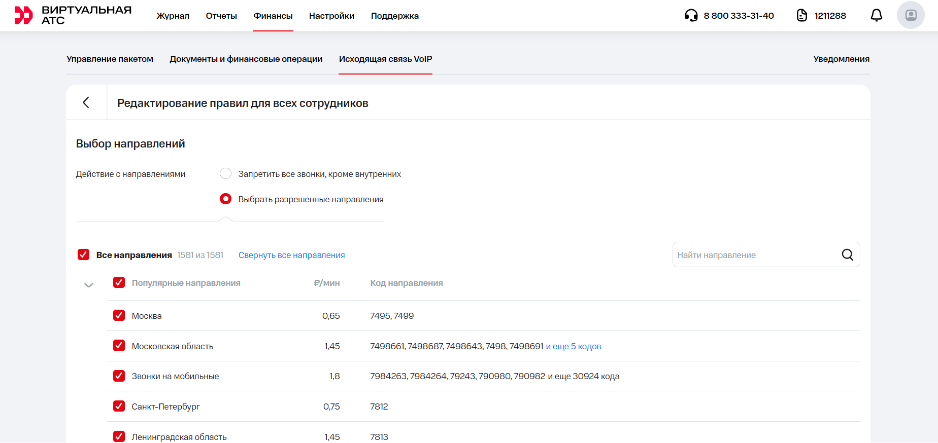 В целях безопасности и экономии бюджета вы можете ограничить направления звонков для всей компании или для отдельных сотрудников в разделе «Финансы» → «Исходящая связь VoIP».