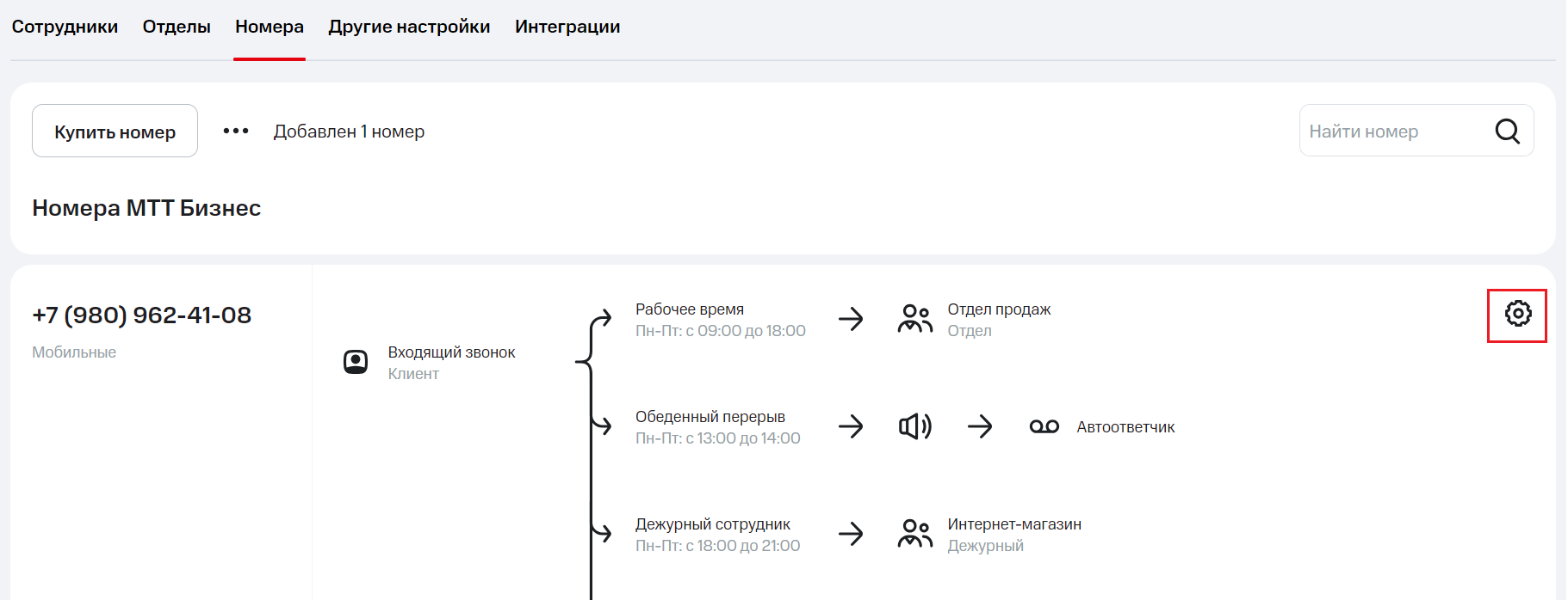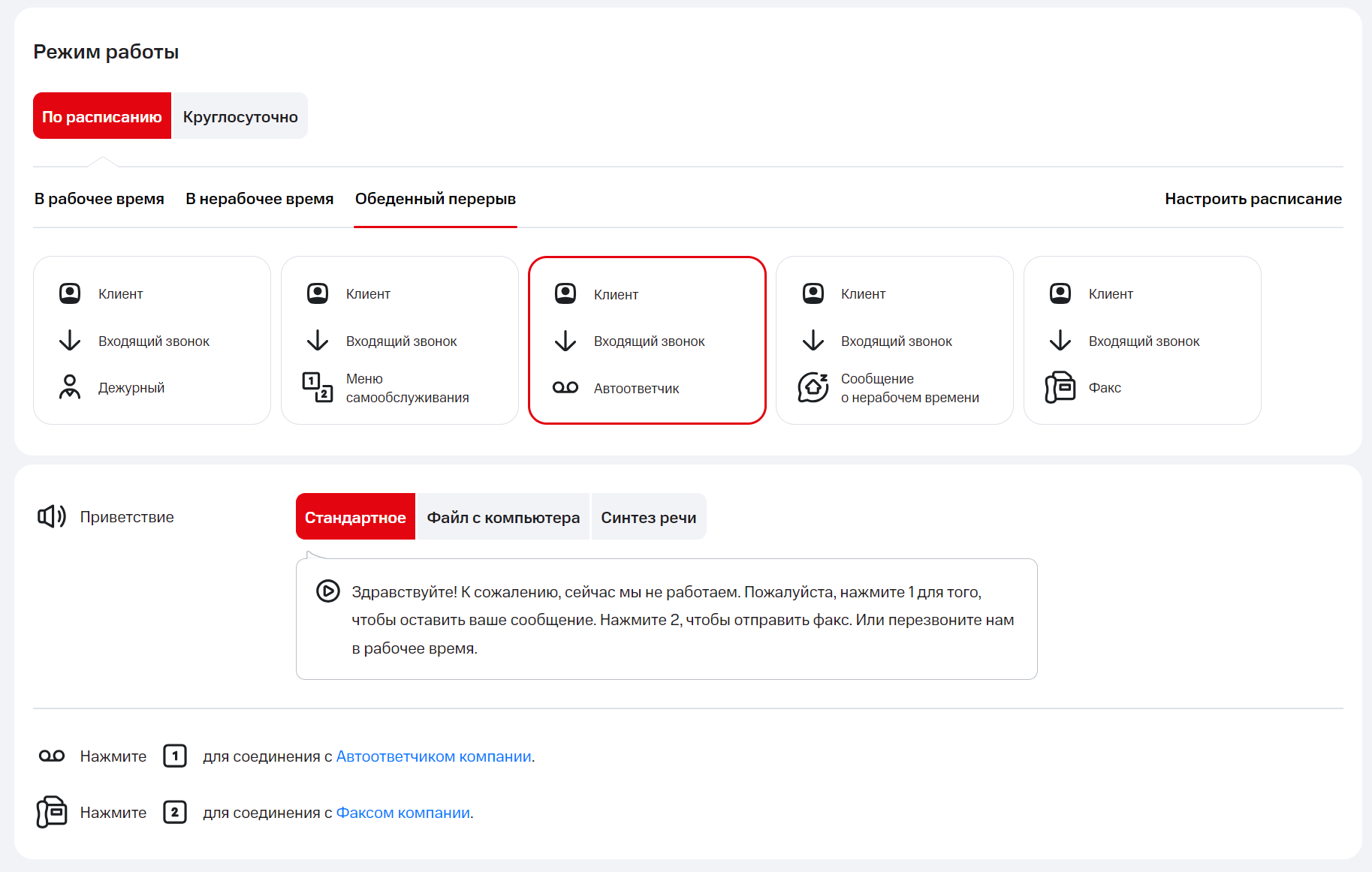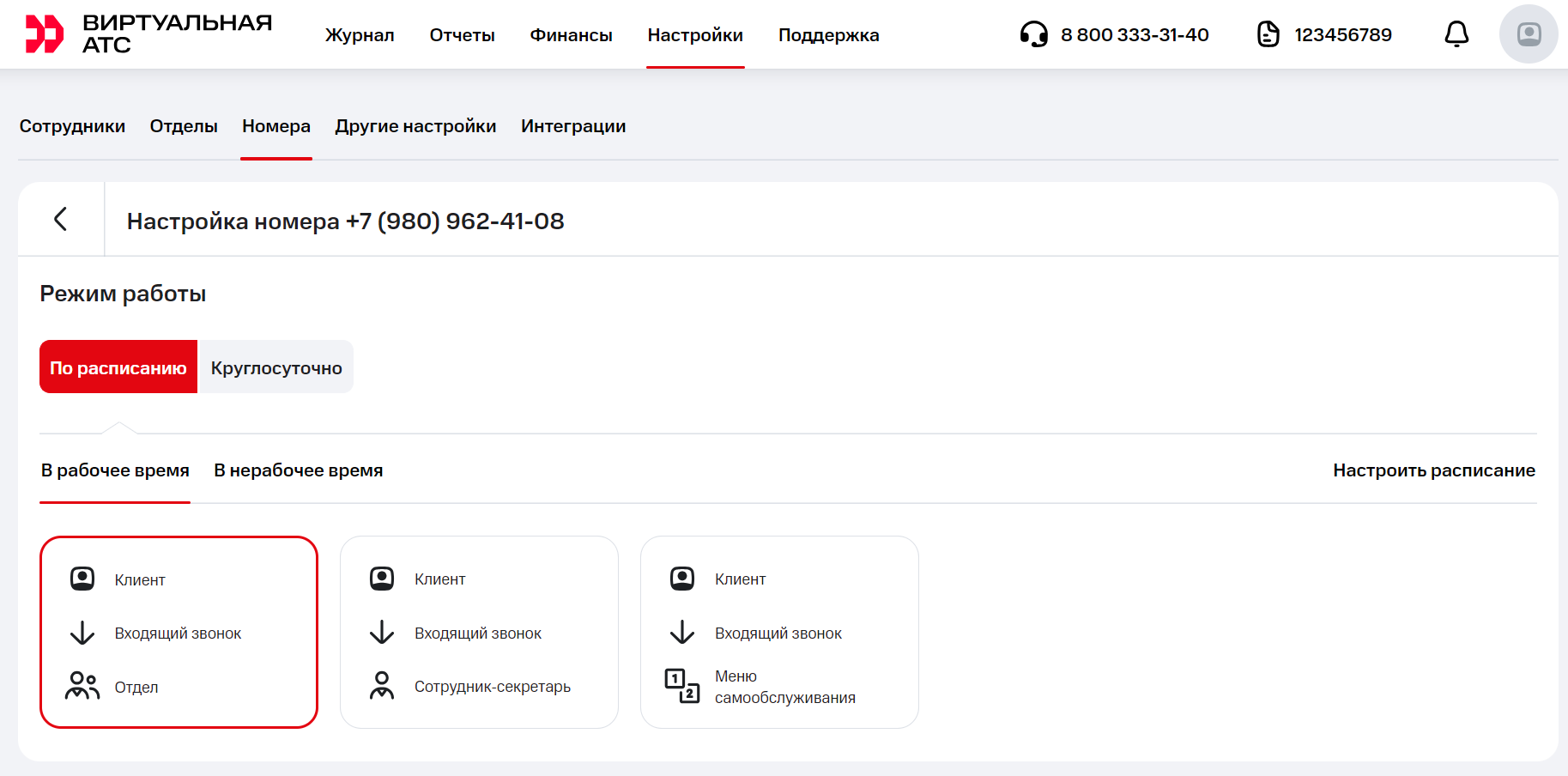 Выберите номер, для которого нужно установить расписание. В разделе «Режим работы» перейдите на вкладку «По расписанию» и нажмите «Настроить расписание».