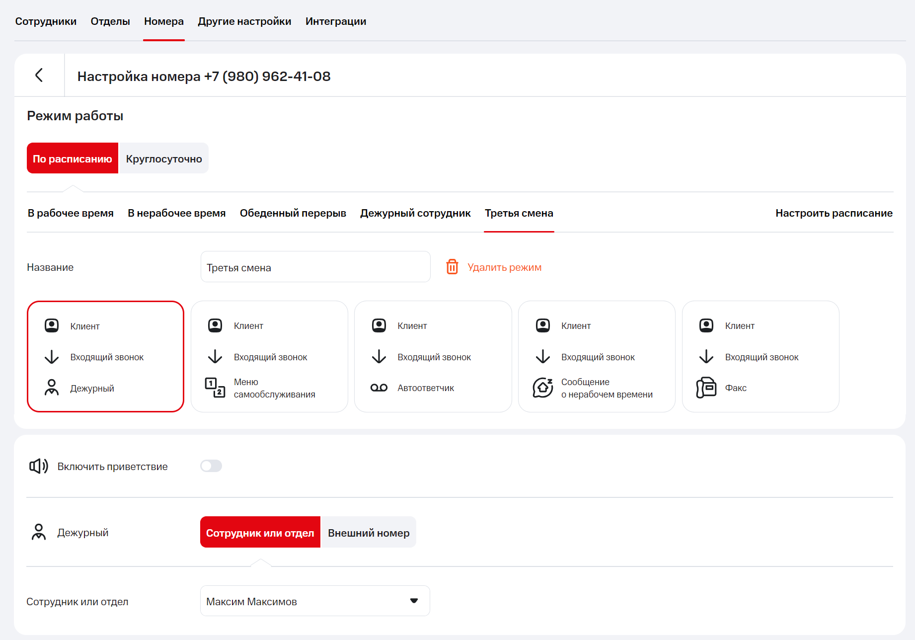 Обратите внимание: если в праздничные дни звонки на номер будет принимать дежурный сотрудник, при настройке производственного календаря в режиме работы выберите вариант «Дежурный сотрудник» и настройте прием звонков.