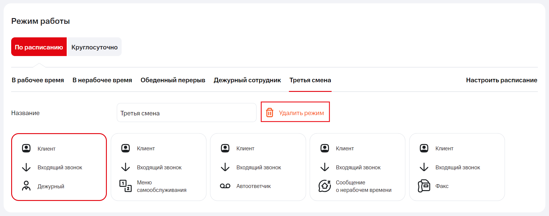 5. Теперь настройте маршрут приема звонков для своего интервала. Для этого поднимитесь в верхнюю часть экрана настройки. В списке режимов работы найдите свой вариант (в нашем примере это «Третья смена») и выберите, что следует сделать Виртуальной АТС, если клиент позвонит в указанное время: