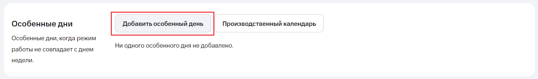 Например, вам нужно в сокращенный рабочий день уменьшить рабочие часы и в начале, и в конце дня. Создайте два особенных дня на одну дату. В первом укажете нерабочее время с утра, а во втором – нерабочее время вечером.