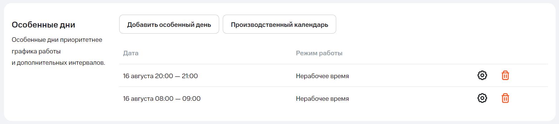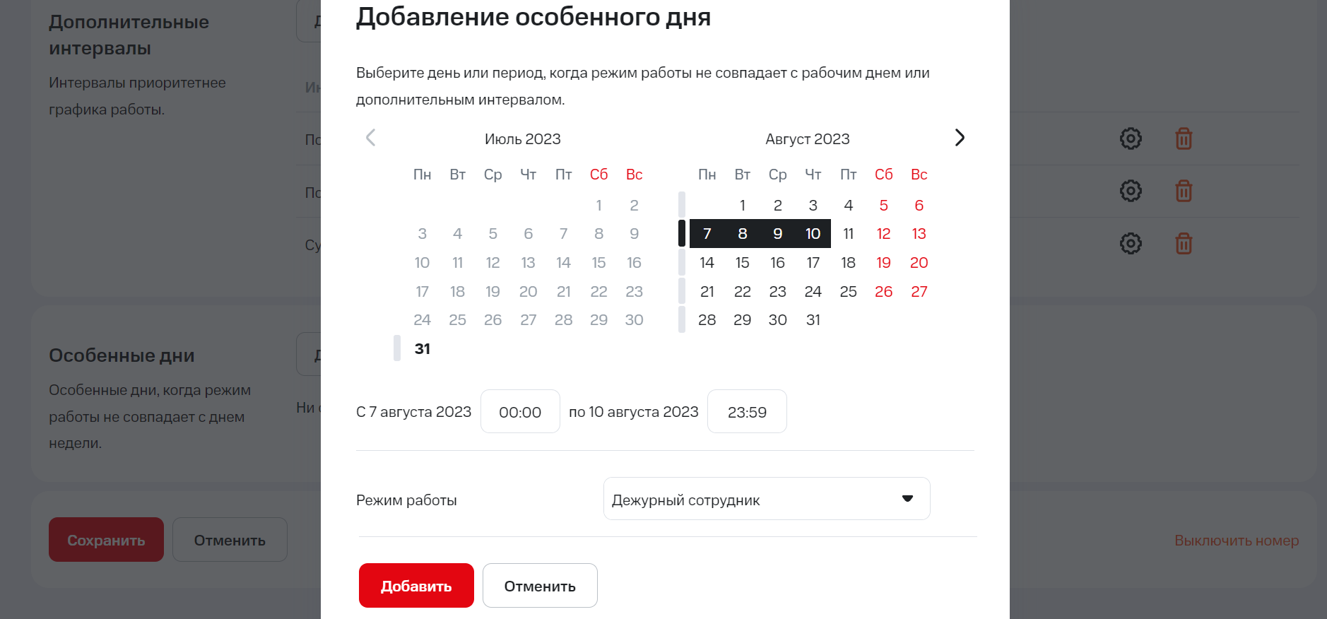 - особенный день – 16 августа с 8:00 до 9:00. И выберите режим работы для этого интервала – нерабочее время или дежурный сотрудник;