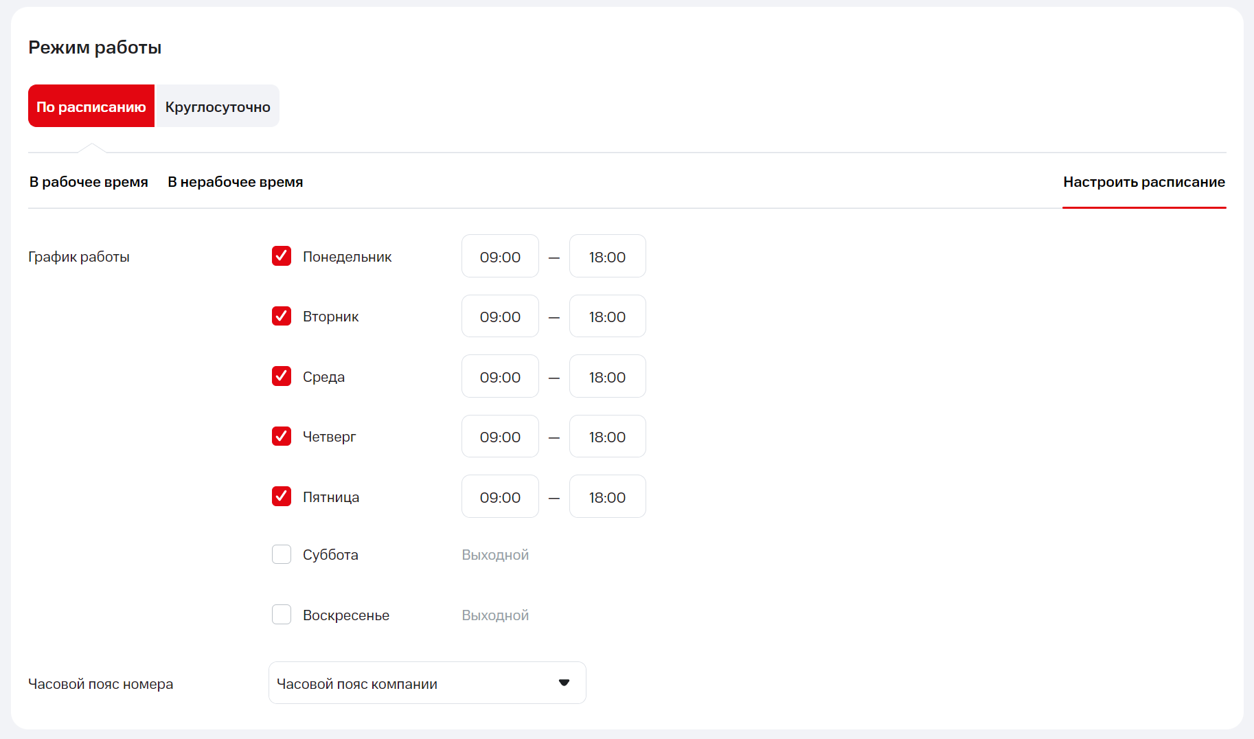 По умолчанию для каждого номера график работы устанавливается в часовом поясе компании. Но если настраиваемый номер должен принимать звонки в другом часовом поясе, отметьте это в расписании номера.
