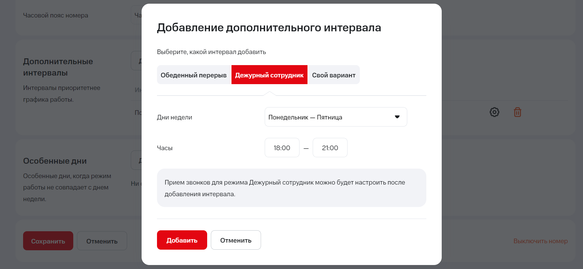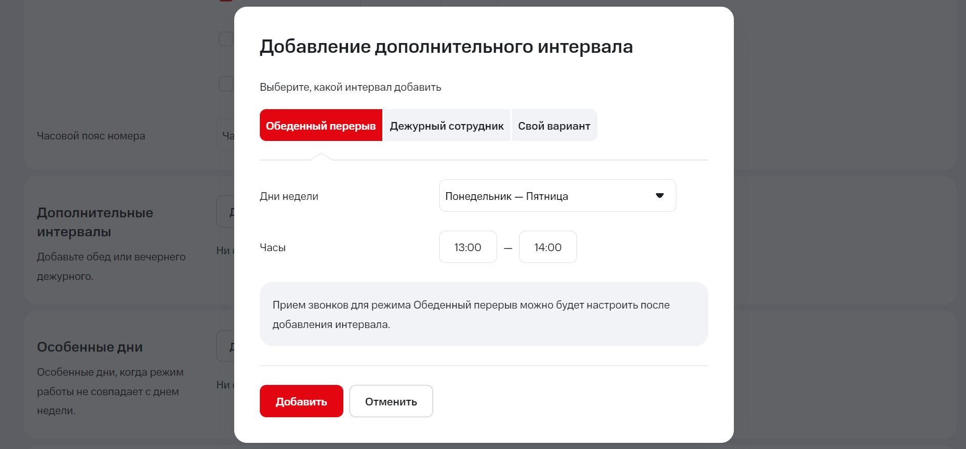 Если работа в вашей компании организована сложнее и для создания корректного расписания вам недостаточно указать время обеденного перерыва и дежурства, вы можете создать собственный дополнительный интервал и настроить для него правила обработки входящих. Своих дополнительных интервалов может быть сколько угодно.