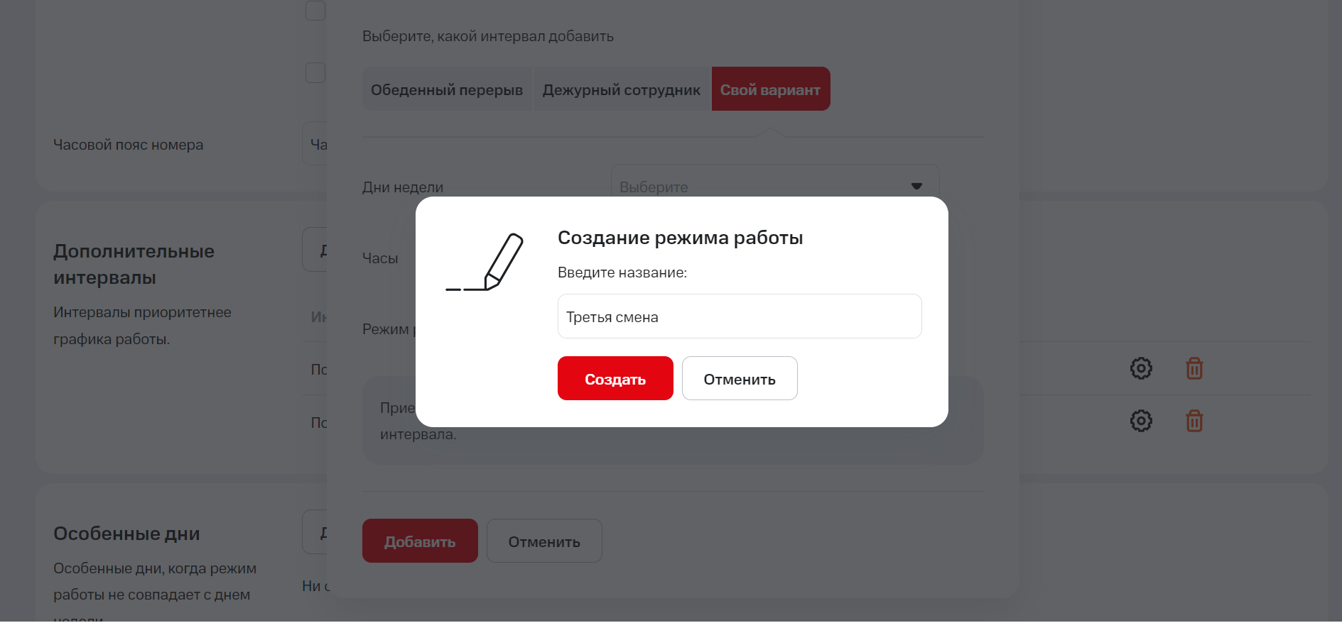 2. Нажмите «Настроить расписание». В блоке «Дополнительные интервалы» найдите режим, который хотите удалить (в нашем примере – «Третья смена»), и нажмите на «корзину» справа.