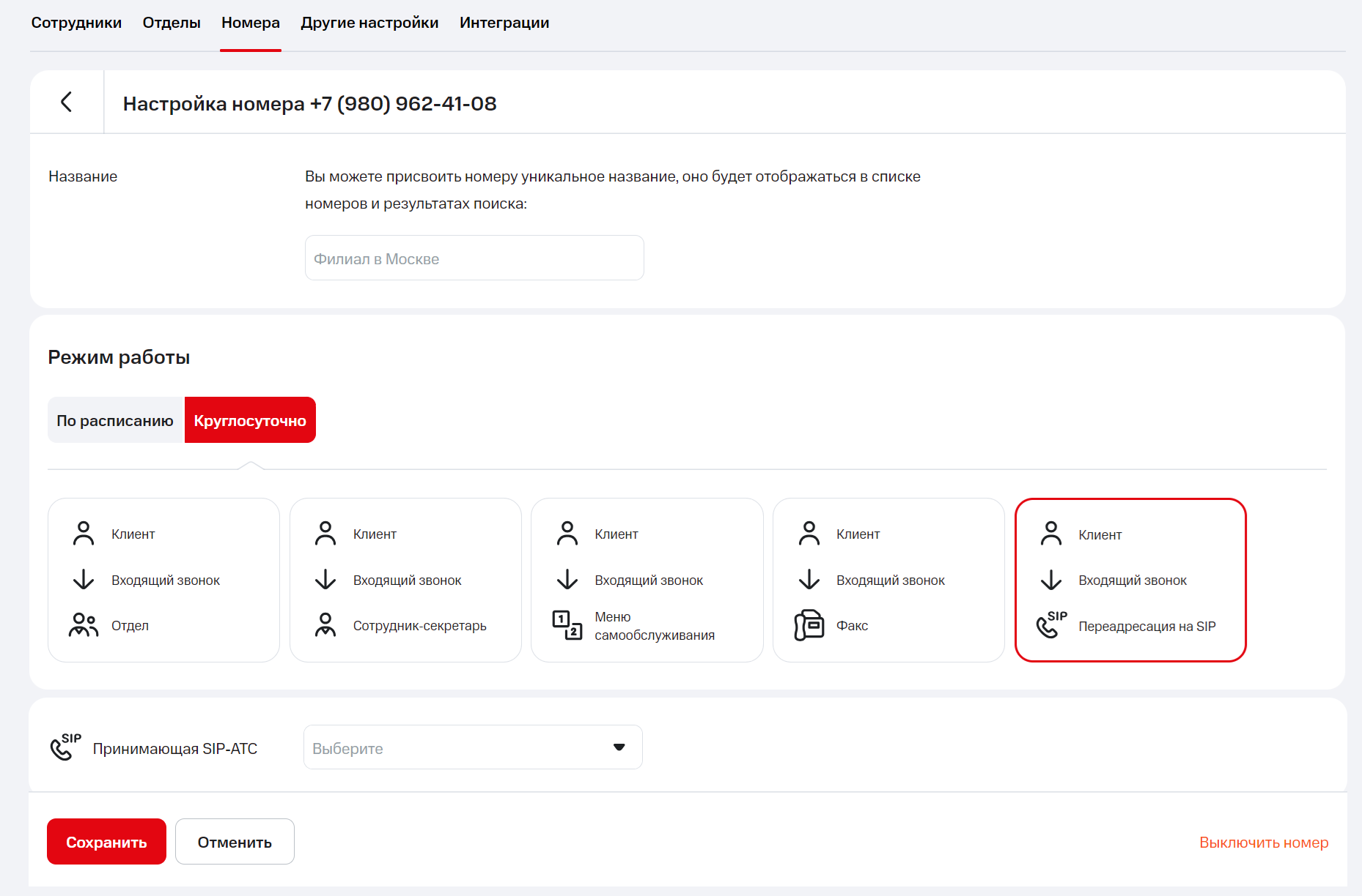 Чтобы настроить переадресацию звонка на SIP-АТС, выберите соответствующую вкладку и в выпадающем списке найдите ту АТС, которую подключили ранее через раздел «Подключение других АТС».