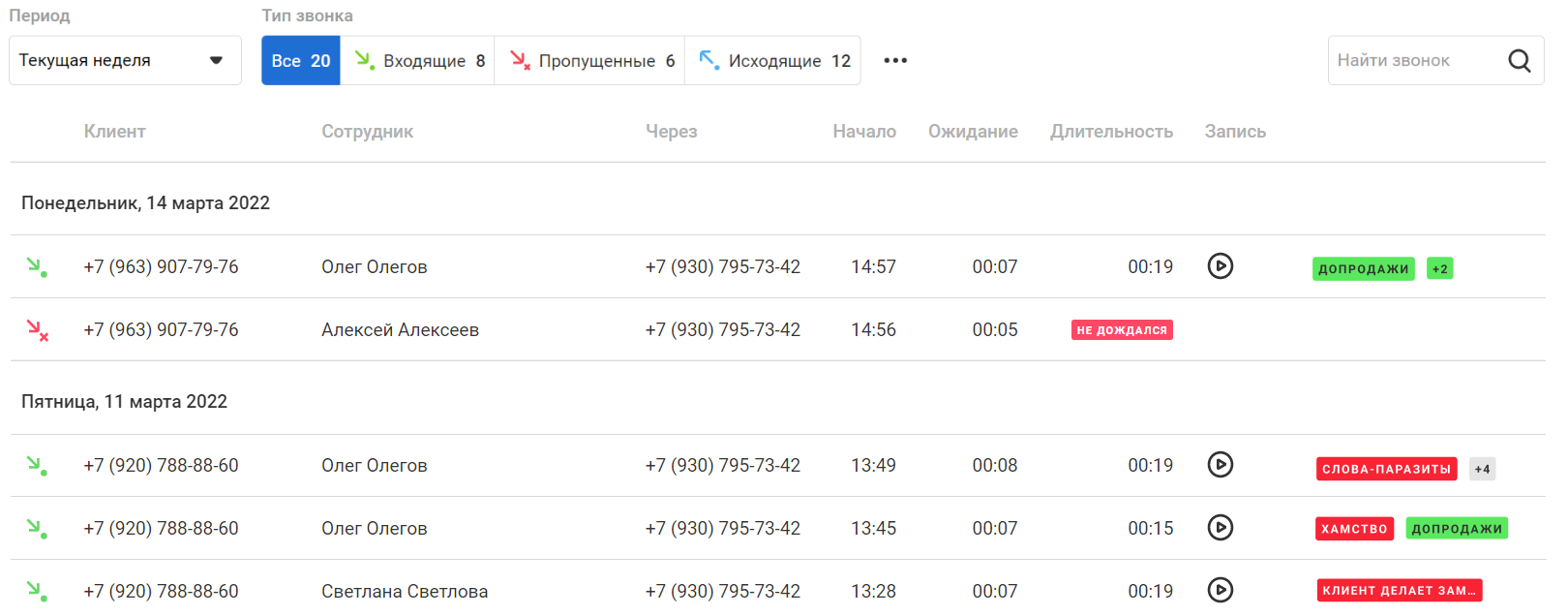 Звонки, в которых Речевая аналитика нашла признаки продаж или плохого обслуживания, в Журнале сопровождаются цветными метками. Они содержат название признака и для наглядности выделяются цветами: зеленый – признаки продаж, а красный – признаки плохого обслуживания.