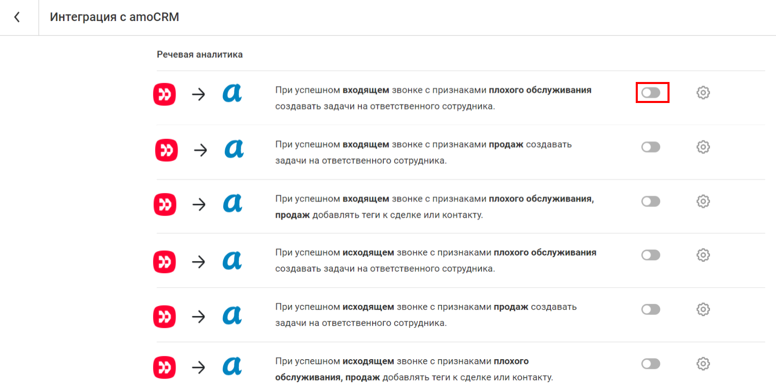 Для примера настроим создание задач для входящих звонков с признаками плохого обслуживания. Это самый верхний сценарий интеграции в списке «Речевая аналитика».