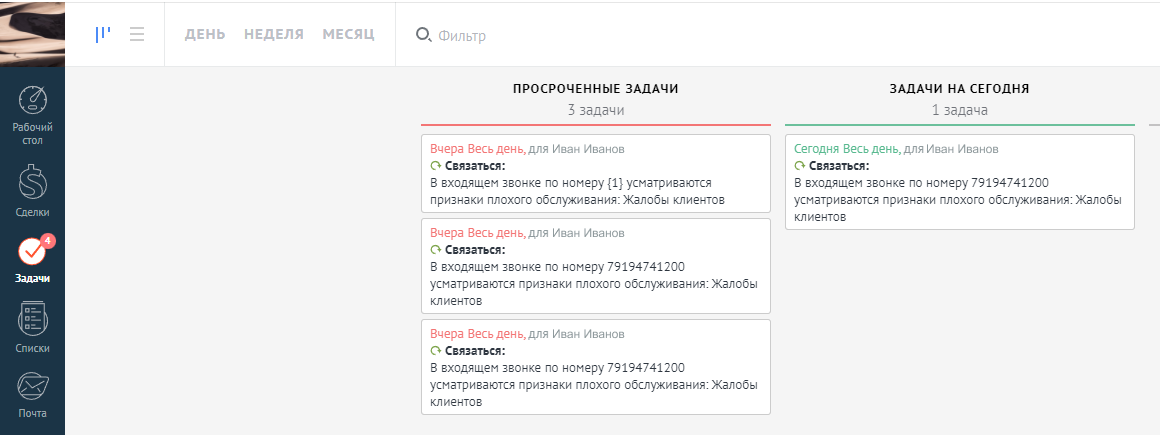 Задачи, автоматически созданные в amoCRM после звонков с признаками плохого обслуживания, будут выглядеть так.