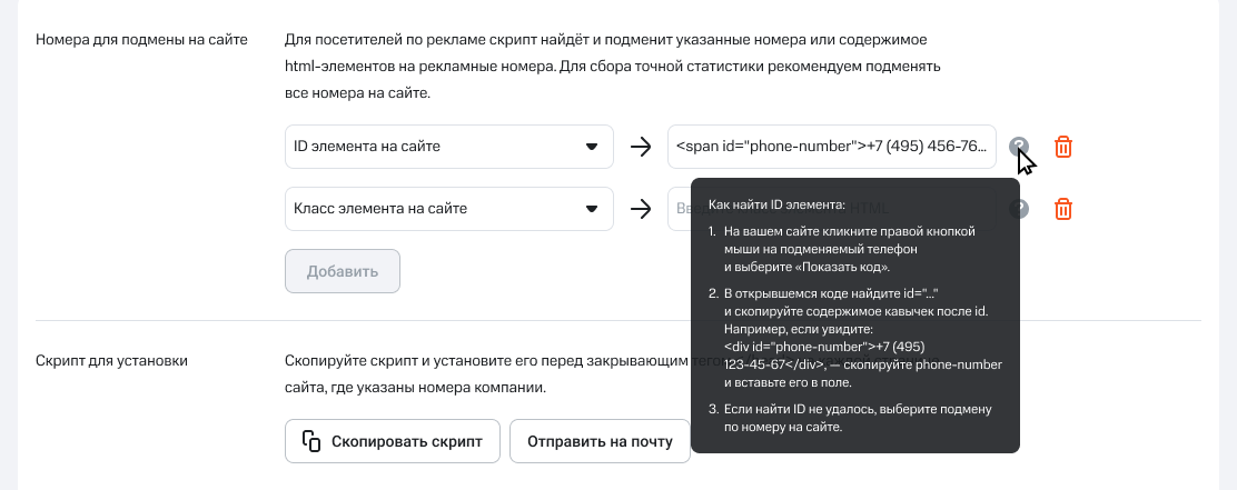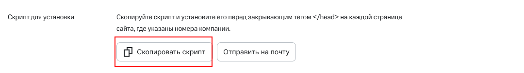 Скопируйте код для подбора номеров и установите его перед закрывающим тегом </head> на каждой странице, где требуется подбор номера. Для этого нажмите на кнопку «Скопировать код». Это поможет своевременно узнавать о возникновении ошибок в работе коллтрекинга.