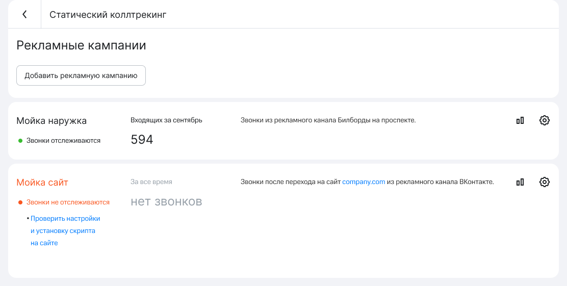 Рекомендуем заходить в список рекламных кампаний для проверки статуса коллтрекинга хотя бы раз в неделю.